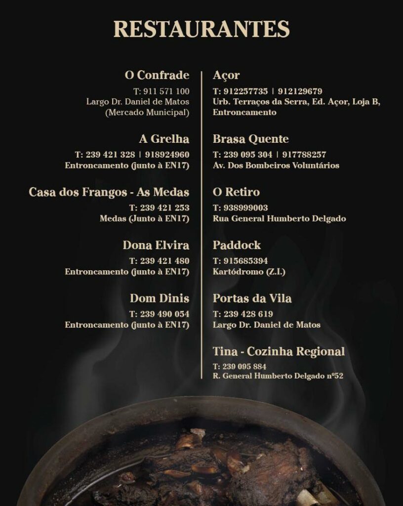 Todos os anos, no mês de janeiro, Vila Nova de Poiares é invadida por amantes da tradicional Chanfana. O prato, que é considerado uma das 7 Maravilhas à Mesa de Portugal, vai estar em destaque no periodo entre os dias 9 e 18 de janeiro.