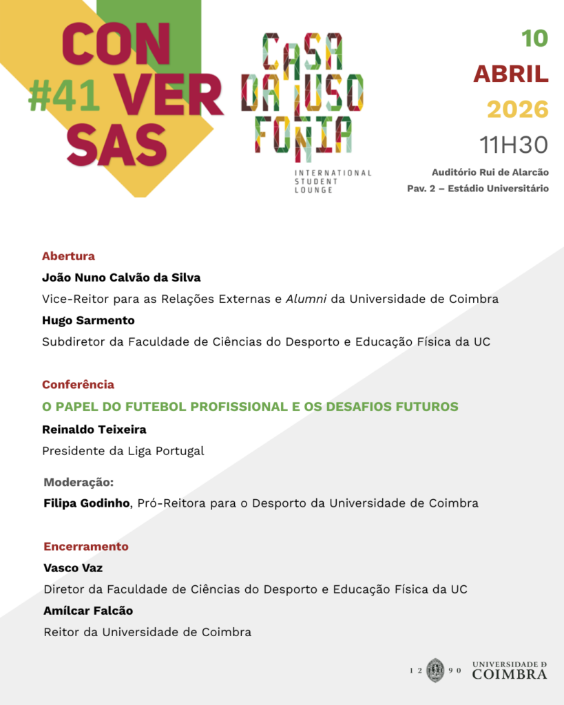 A sessão vai contar com intervenções de abertura pelo Vice-Reitor para as Relações Externas e Alumni da UC, João Nuno Calvão da Silva, e pelo Subdiretor da Faculdade de Ciências do Desporto e Educação Física da UC, Hugo Sarmento.