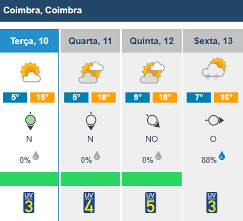 O Instituto Português do Mar e da Atmosfera (IPMA) prevê dias de céu limpo e temperaturas amenas em Coimbra durante esta semana, com exceção de sexta-feira, quando se esperam aguaceiros.