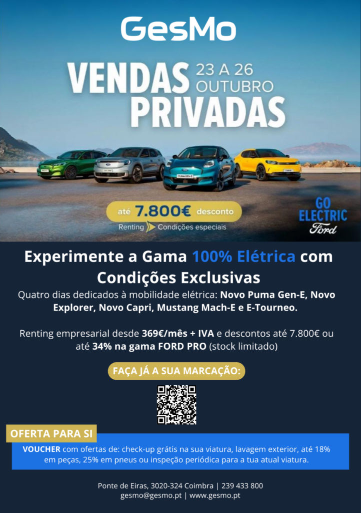 Começam já esta quinta-feira as Vendas Privadas na GesMo, o seu concessionário Ford em Coimbra. De 23 a 26 de outubro, terá quatro dias únicos, com condições exclusivas para adquirir o seu NOVO FORD.